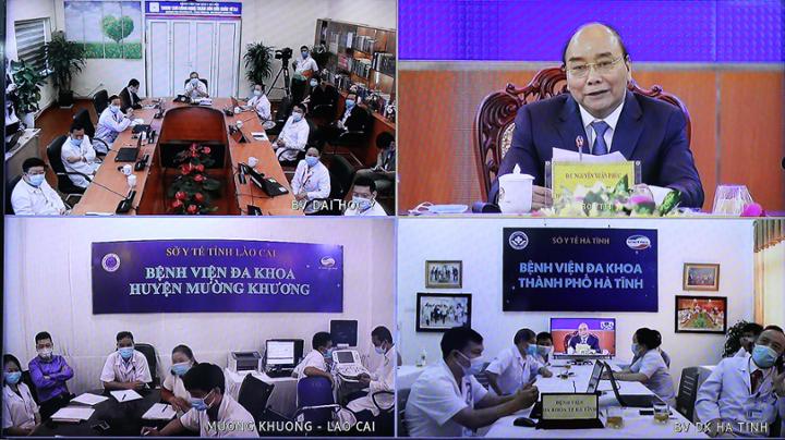 “Nhân đây tôi xin chào những chiến sĩ áo trắng dũng cảm, kiên cường, đi đầu trong phòng chống đại dịch của COVID-19 ở nước ta”, Thủ tướng nói. Từ nhiều năm nay, ngành y tế đã triển khai một số hoạt động khám bệnh từ xa, phẫu thuật từ xa, bệnh án điện tử. Tuy nhiên, khi dịch bệnh COVID-19 bùng phát, thực tiễn đòi hỏi các bệnh viện phải có thêm kênh khám bệnh từ xa nhiều hơn nữa, phổ cập hơn nữa, giúp tư vấn khám chữa bệnh, giúp người dân tiếp cận dịch vụ y tế nhanh chóng, thuận lợi, ít tốn kém và an toàn, nhất là không cần phải đến bệnh viện khi không cần thiết, giúp giảm tải cho bệnh viện, tránh lây bệnh.